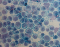 ■ 細胞診検査:細い針を腫瘤に刺すことにより細胞を採取し、どういった細胞から構成されているかを確認します。これにより、非腫瘍性の変化である炎症(細菌などの感染による)や過形成(正常組織の増殖)などと腫瘍を鑑別できることがあります。また、腫瘍であった場合、良性悪性の鑑別、腫瘍を構成する細胞の種類(上皮系、非上皮系)の鑑別ができることがあり、一部の腫瘍(リンパ腫,肥満細胞腫など)については細胞診により確定診断が可能となります。麻酔をかける必要がなく、動物への侵襲も少ないといった利点があります。ただし、腫瘍の一部の細胞しかとることができないため、有意な結果が得られないことがあるという欠点もあります。