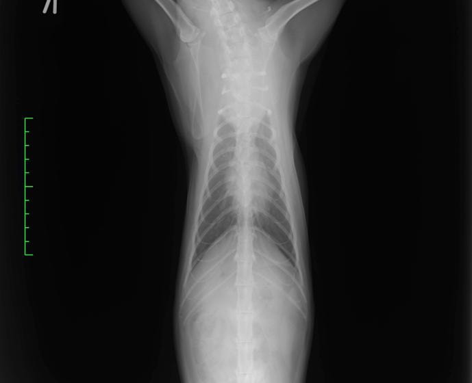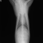 胸腔内にある前縦郭リンパ節や胸腺の腫大が特徴です。犬・猫共に発生は少ない型です。腫大したリンパ節等の圧迫や胸水の貯留による呼吸不全を示すことがあります。