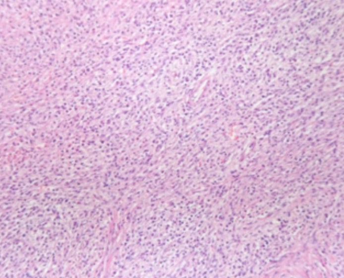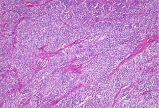 レントゲン検査所見から、骨もしくはその周囲組織に発生した腫瘍の可能性が考えられたため、病変部の細胞診検査およびジャムシディ生検針を用いた病変の骨生検を実施した。病理組織検査の結果、非上皮性の悪性腫瘍である“肉腫”と診断された。