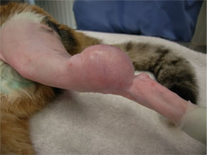 後肢の肉球からの出血を主訴に来院。肉球と皮膚との境界部に直径約5mmの傷(糜爛)を認めた。抗菌剤による治療で一時的に良化したが、その後同部位に腫瘤の形成が確認された。腫瘤が急速に増大傾向を示したため、切除手術を実施、病理組織検査にて“悪性黒色腫”と診断された。