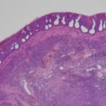 当院で肛門腺絞りの処置を実施した際に、左肛門嚢付近に5mm大の腫瘤の形成を認めた。肛門嚢の炎症の可能性を考慮し抗生剤による治療を行ったが改善が得られず、細胞診検査を実施、“肛門嚢アポクリン腺癌を疑う”との結果であった。胸部および腹部への転移所見が無いことを確認後、左肛門嚢および腫瘤の摘出を実施、病理組織検査にて“肛門嚢腺癌”と確定診断された。