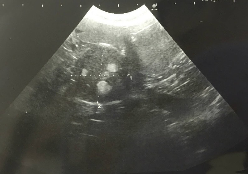 他院にて肝酵素(GPT、ALP)上昇が認められ、当院にて超音波検査を行うため来院。肝酵素の他にTG、TP、ALBの上昇と、Cre、Naの低下を認めていた。来院時、多飲多尿症状を聴取。肝臓・胆嚢、副腎に対する超音波検査を実施したところ、左側副腎頭側部に由来不明の腫瘤病変を確認。CT検査を行い、左側副腎腫瘍を疑う(腺癌の可能性、血管の巻き込み等ないためオペ推奨)との診断が得られたため、左側副腎腫瘍摘出手術を実施。3.2cm×3.0cm×3.0cmの腫瘤性病変を摘出し、病理検査にて「副腎皮質腺腫(良性腫瘍)」と診断された。術後はホルモン補充としてのステロイド投与は必要なく、肝数値上昇に対する内服薬のみ継続している。数週間で多飲多尿症状も落ち着き、良好な経過を辿っている。