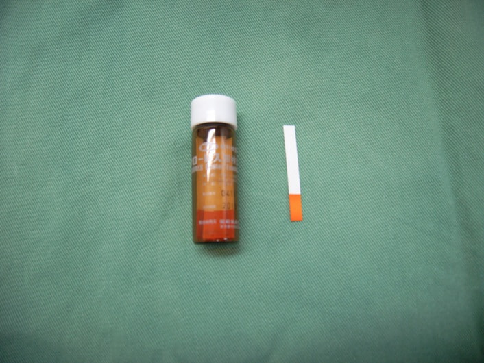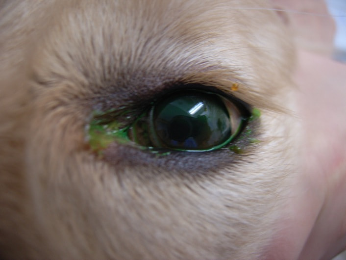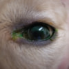 ⑥フルオレセイン染色による検査:角膜の表面に染色液を垂らすことで角膜潰瘍(潰瘍の範囲と程度)を把握することができます。