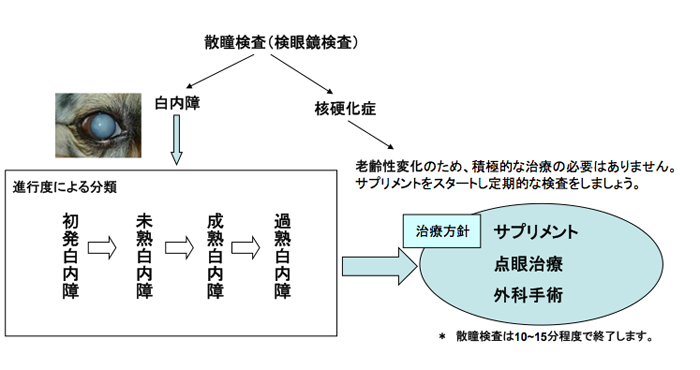 散瞳処置により、水晶体の混濁の程度・眼底検査などを実施し、現在の白内障の程度を把握し、今後の方針を決定していきます。2~3ヶ月おきの検診をお薦めいたします。