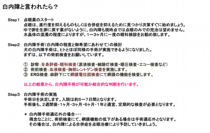 最近夜の散歩を嫌がる、暗い所で物にぶつかる、眼が充血している、眼やにが出る、涙の量が増えた、眼が濁って来たなど気になることはございませんか?上記のような症状がありましたら、眼科検査をお勧め致します。また、犬の眼科疾患は、遺伝性疾患が多いことから、健康診断において早期発見することが、眼科治療に予後を左右するといわれています。是非、定期的な眼科検査をお勧め致します。