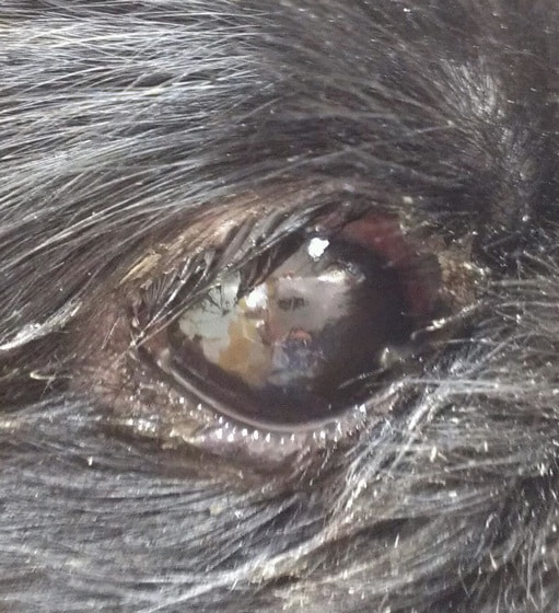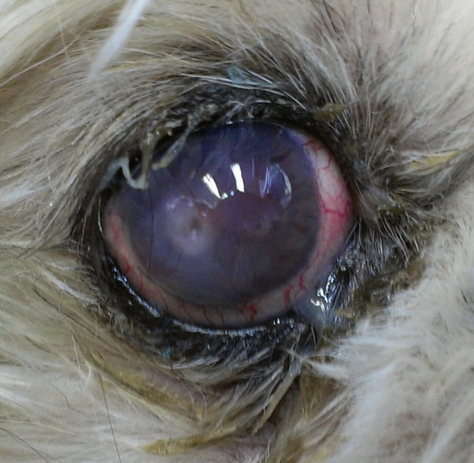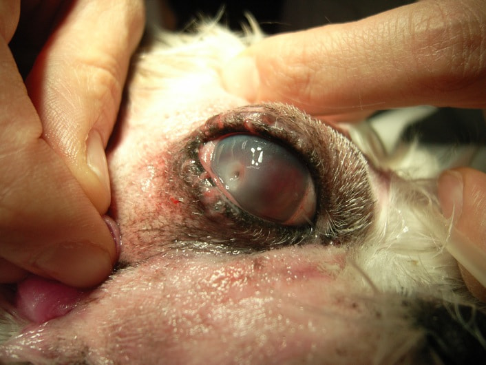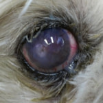 眼球内を循環している房水の流出が何らかの原因で障害されることによる、眼内圧の上昇のことをいいます。眼の充血、痛みなどを伴い、眼球の腫脹が起こり、最終的には視覚障害に至ります。ご家庭で気付かれる症状としては、元気消失、頭を壁にこすりつけながら歩く、物にぶつかるなどが認められます。緑内障は、眼科疾患の中でも緊急対応が必要な疾患です。早期発見が視覚維持に繋がります。