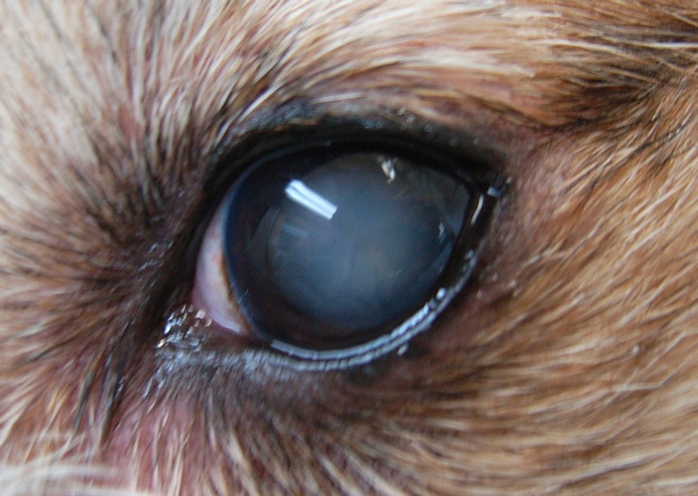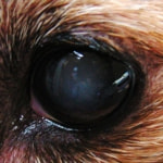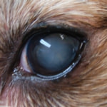 白内障とは、眼の中にあるレンズ(水晶体)の混濁している状態を示します。混濁の程度により、視覚障害を生じ最終的には失明に至ります。白内障自体は、痛みを伴うことはありませんが、混濁が進行することで、ぶどう膜炎(眼の中の炎症)をはじめとし、緑内障、網膜剥離など様々な合併症により痛みを伴う場合があります。