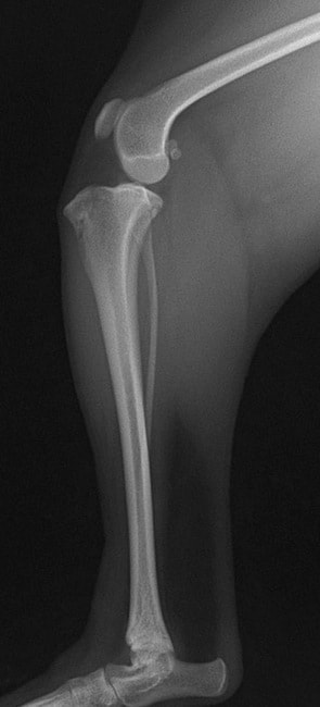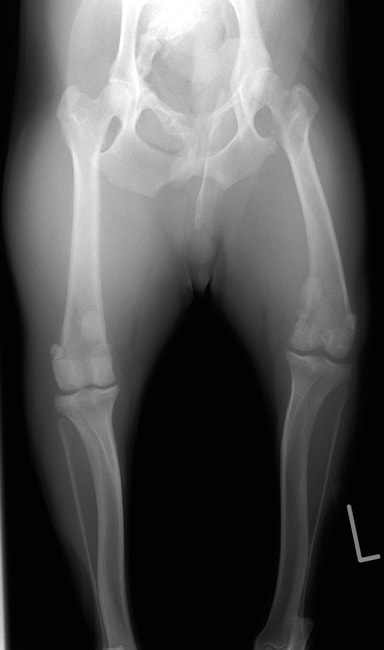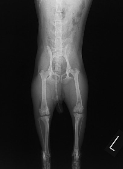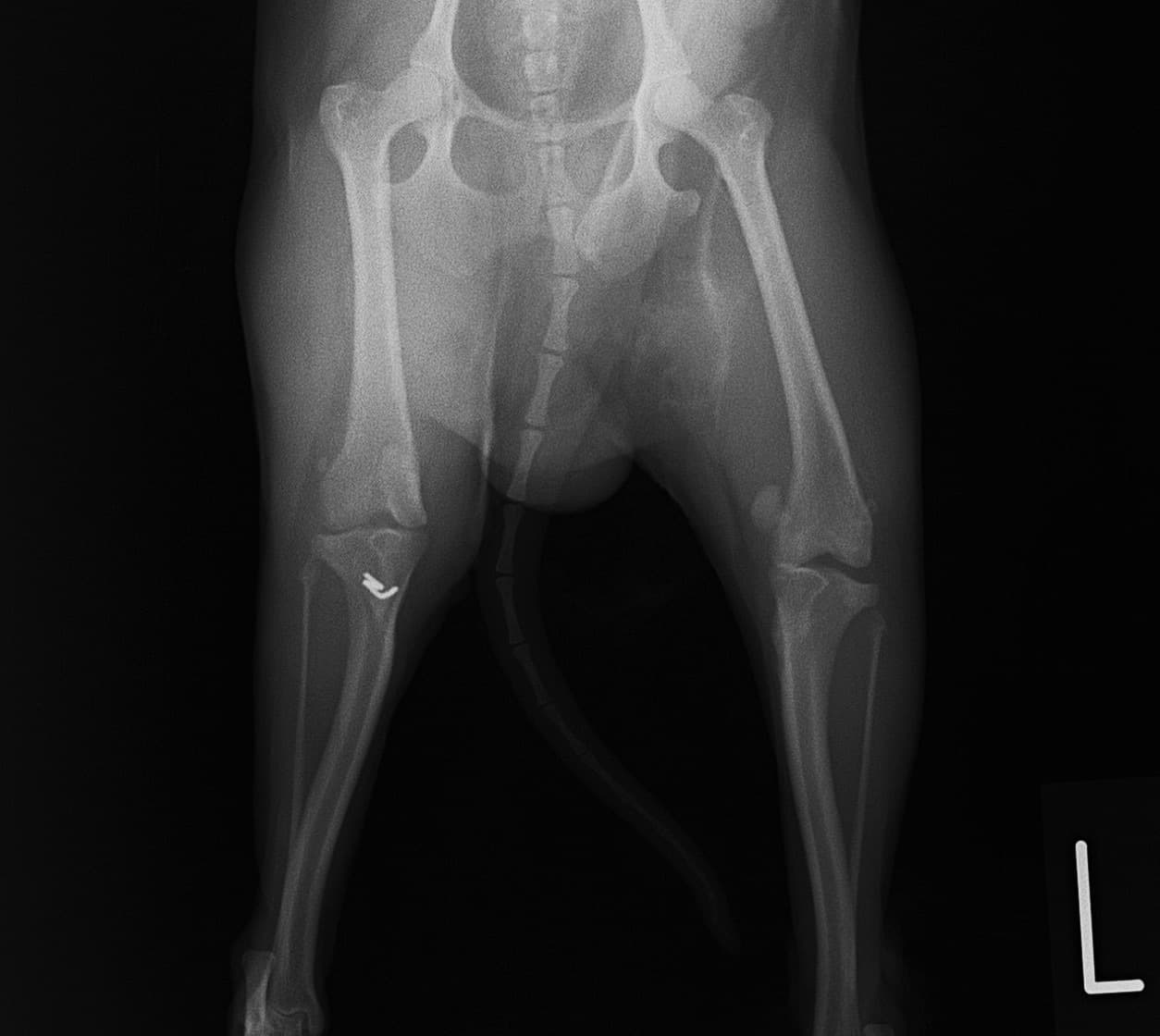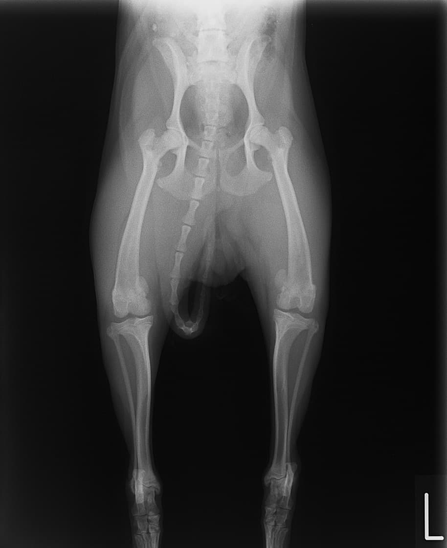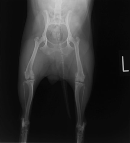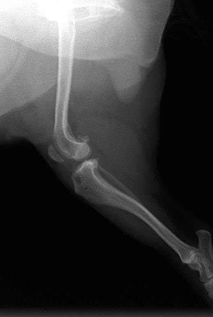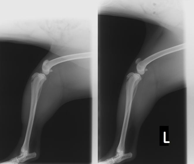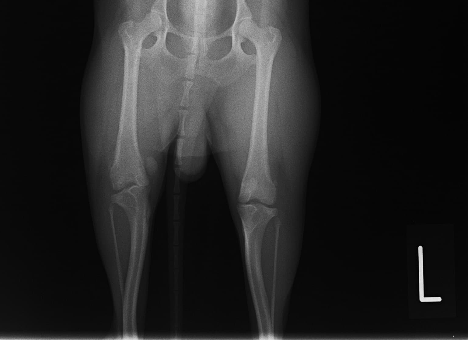 - 膝蓋骨は常に脱臼状態にあり、指で押せば整復できるがすぐに脱臼してしまいます。顕著な跛行がみられます。