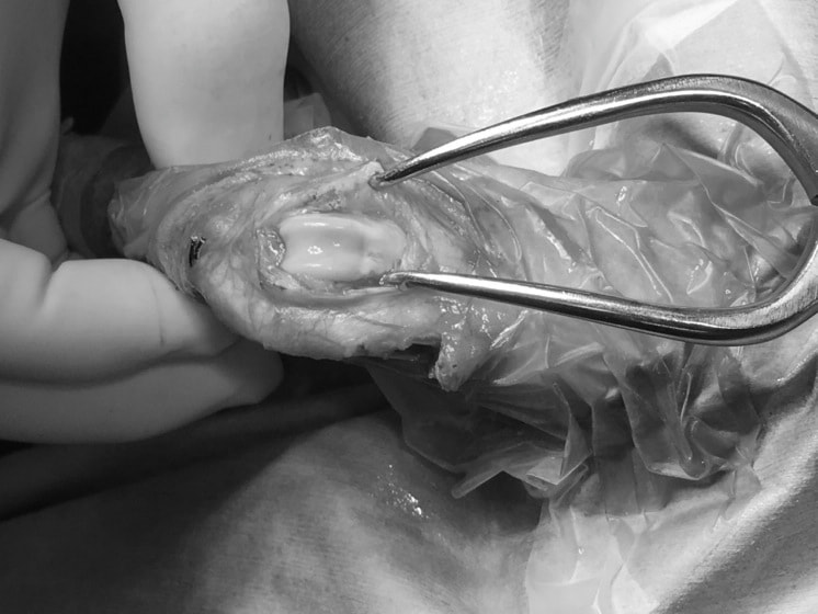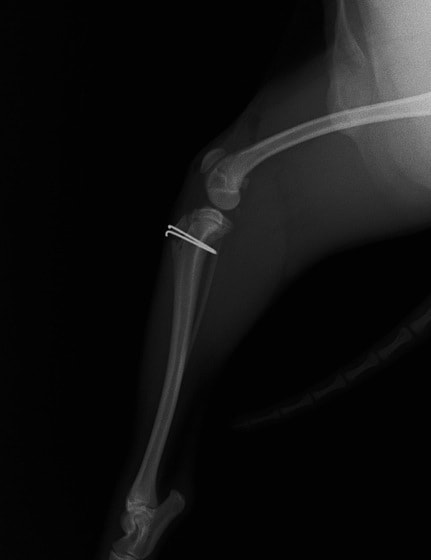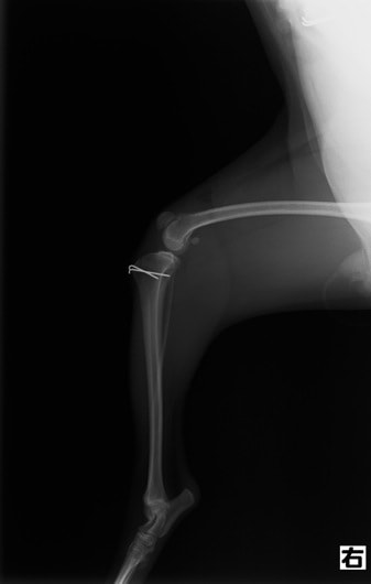 右側の膝蓋骨脱臼は上記手技で整復されたものの、左側はそれのみでは膝蓋骨が浮く様子が認められた。その為、PDS縫合糸にて膝蓋靱帯を1糸のみ縫合し、靱帯の縫縮を行った。