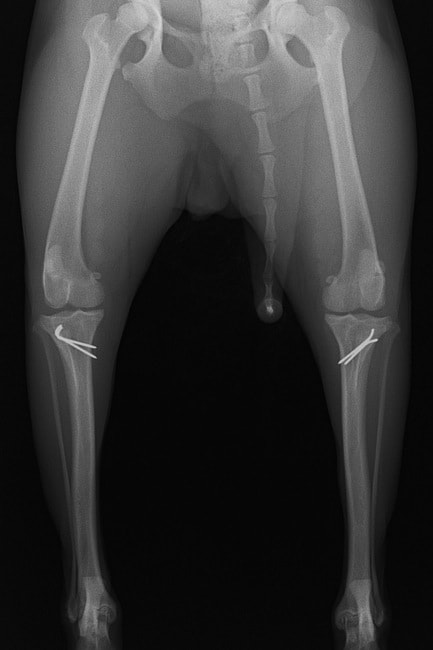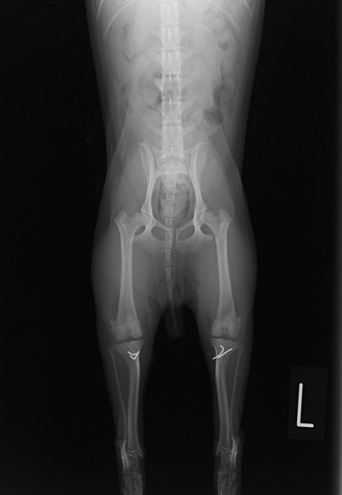 以前から左右後肢の跛行が認められ、整形外科学的検査・レントゲン検査により左右の膝蓋骨脱臼が認められた。症状が重度である左膝の膝蓋骨脱臼整復術を行った。外科手技は縫工筋及び内側広筋の解放、脛骨粗面の外側転位、滑車ブロック形造溝術、内外側関節方の縫縮を実施した。術後一か月時点で、左の膝蓋骨は安定しており経過は良好である。