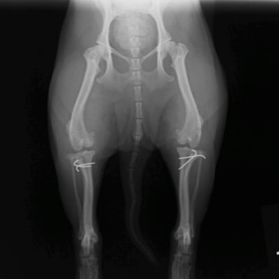 2ヶ月前から間欠的跛行が認められ、両膝の膝蓋骨脱臼整復術を行った。