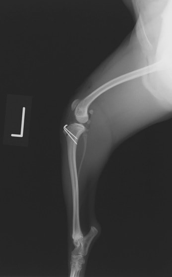時々肢を挙上する間欠的な歩行異常が多く、常に肢を挙上するケースは少ないです。肢を後ろに伸ばす動作を繰り返し、それを主訴に来院されることもあります。日常生活において膝蓋骨の脱臼と整復を繰り返し、関節軟骨が磨耗すると症状は悪化し、歩行異常はより顕著化します。更に四頭筋機構が関節を安定化させられなくなることも手伝い、前十字靭帯断裂症が併発することもあります。