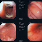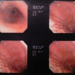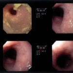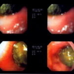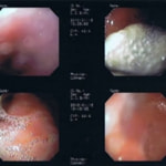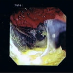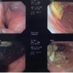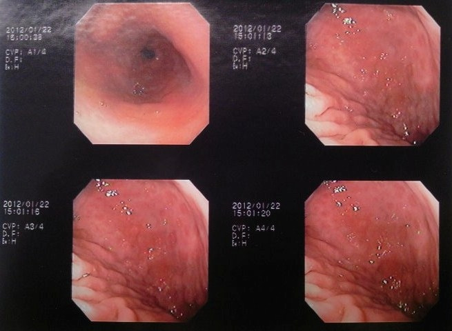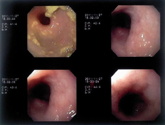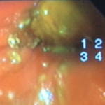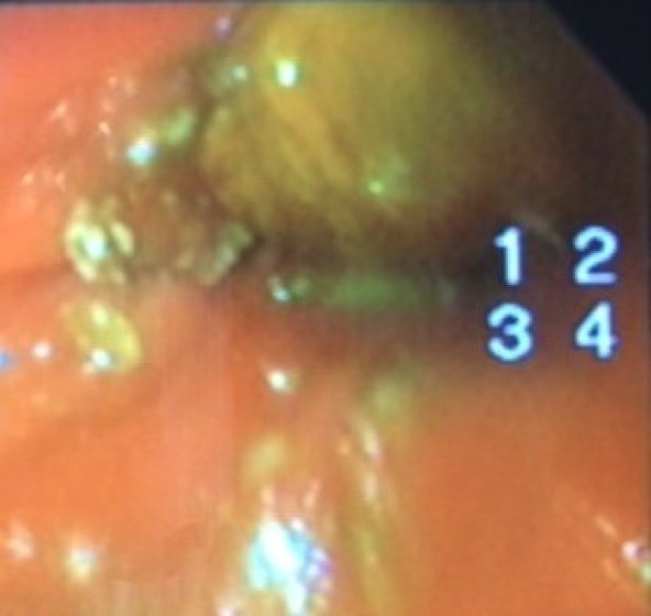 バリウム造影3時間経過するも、胃内からバリウム排泄なく同日内視鏡検査を実施。