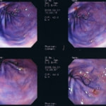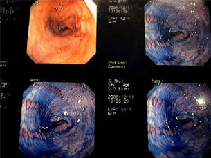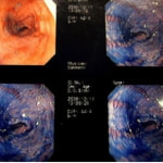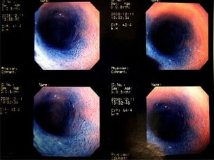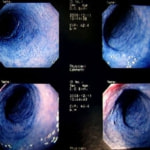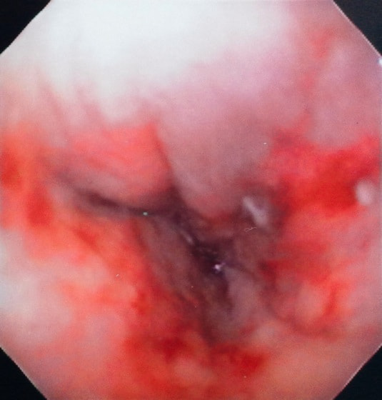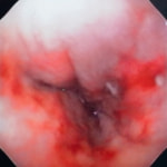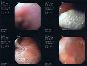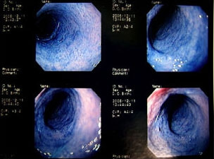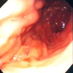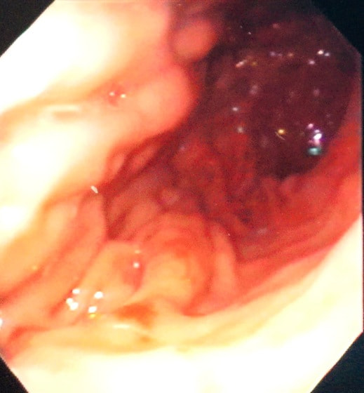 内視鏡検査:肛門付近の直腸全周に、炎症および出血を伴う結節状病変を多数認めた。