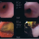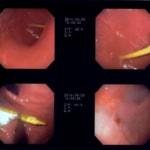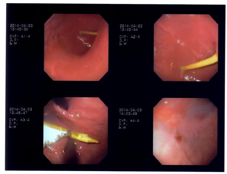 内視鏡検査所見:胃内に竹串の先端部分が残っていたため、異物鉗子にて摘出しました。胃内は、全体的に炎症を伴い、出血している部位も確認されました。摘出後は、胃粘膜保護薬・プロトンプインヒビター(胃薬)の内服2剤ならびに食事療法により経過は良好です。