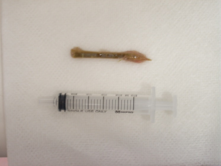 主訴:焼き鳥の竹串を食べたとの事で来院しました。元気・食欲は問題なく、嘔吐などの症状もありませんでした。便にも竹串が1/3程でているとの事でしたが、全ての竹串が出ていないため、内視鏡検査を実施致しました。