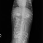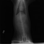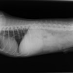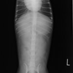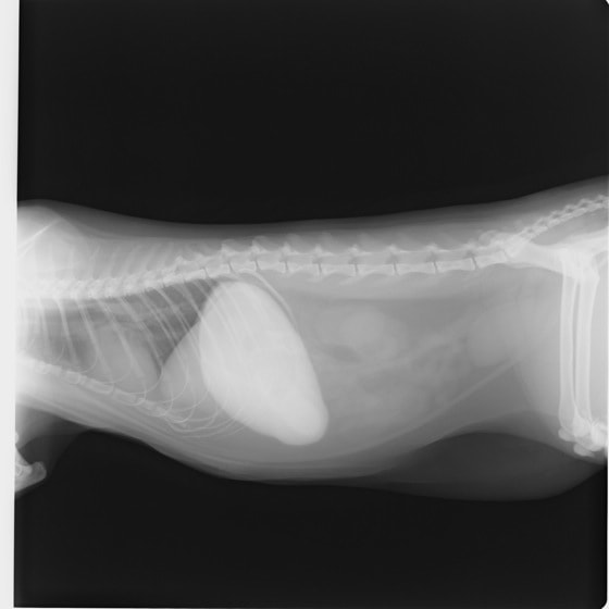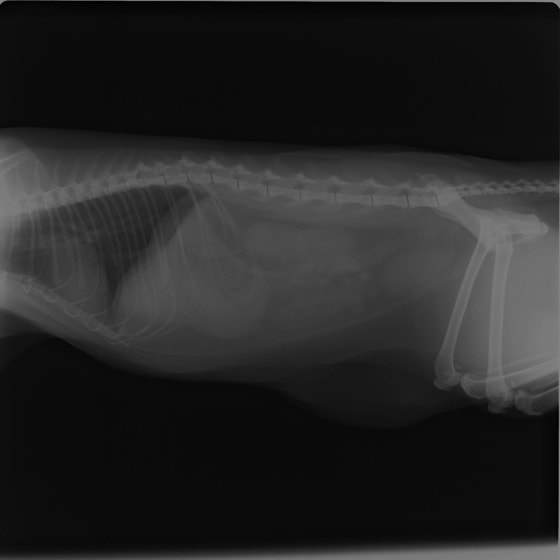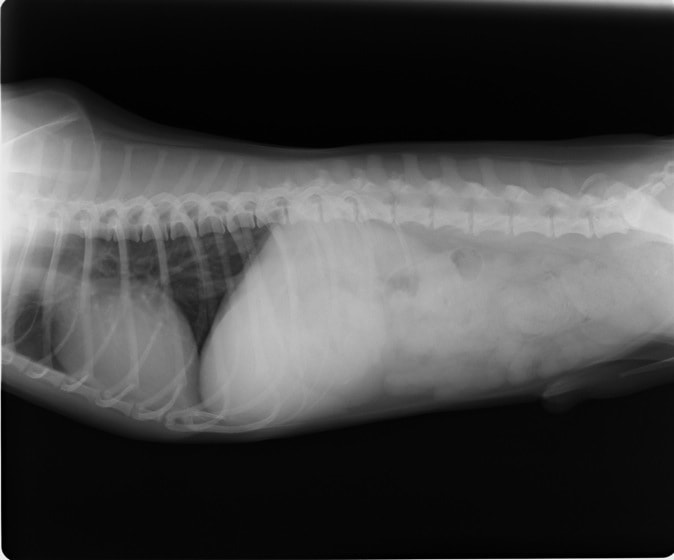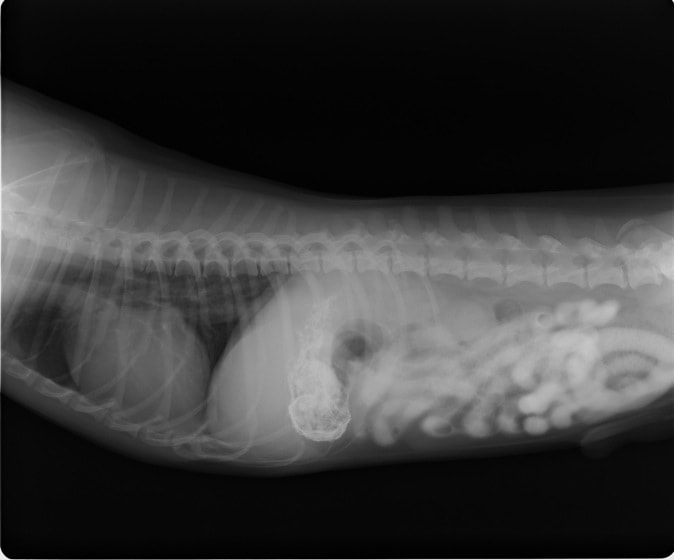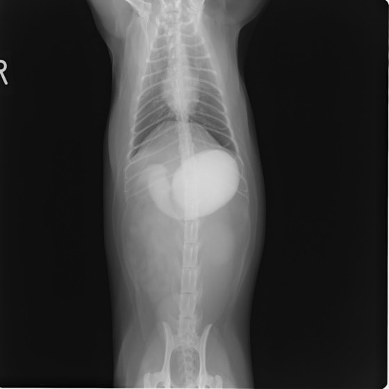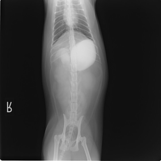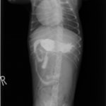単純レントゲン検査:胃内ガス陰影・腸内ガスが少量認められる。