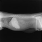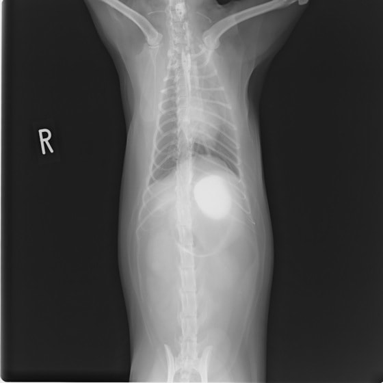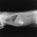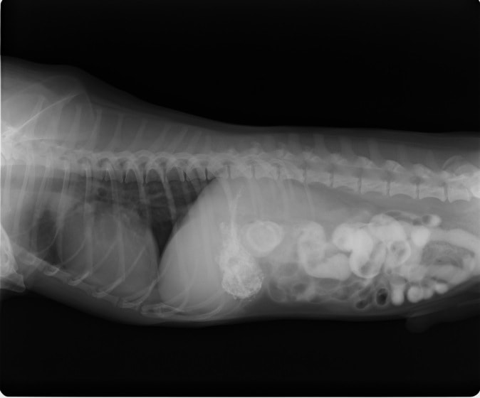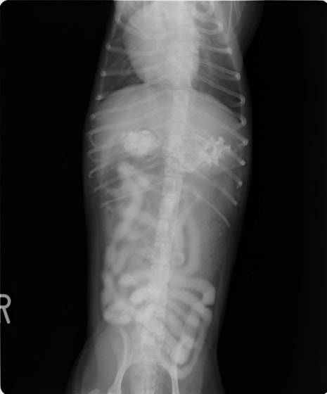 主訴:2日前の夜に桃の種を飲み込んだとのこと。元気・食欲に問題はなく、嘔吐などの消化器症状もみられなかった。誤飲した当日に他院にて催吐処置を試みたが、吐き戻さなかったとのこと。