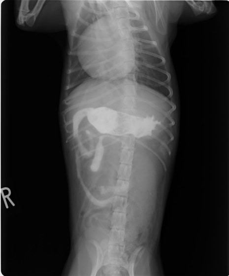 嘔吐が改善しないため、消化管バリウム造影検査を実施。