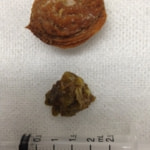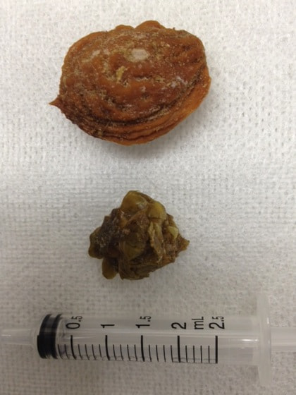 異物内容:桃の種 (約4cm大 写真上)、とうもろこしの芯 (約2.5cm大 写真下)