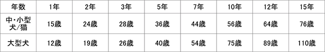 愛犬・愛猫がシニアに入ってきているのか、人間に換算するとどのくらいの年齢になっているのか、現在の愛犬・愛猫の状態に問題があるのか、把握していますか?下の表は、犬猫の年齢を人の年齢に換算したものです。愛犬・愛猫の年齢を把握しておくことは、健康管理をしていくうえで大切です。