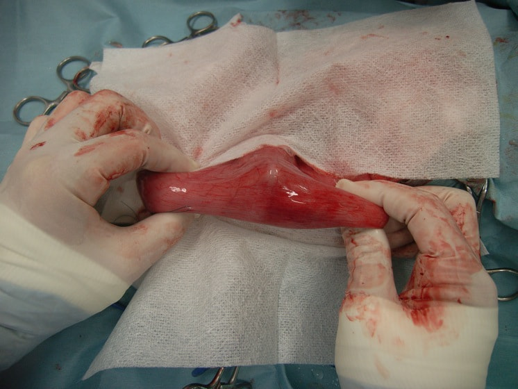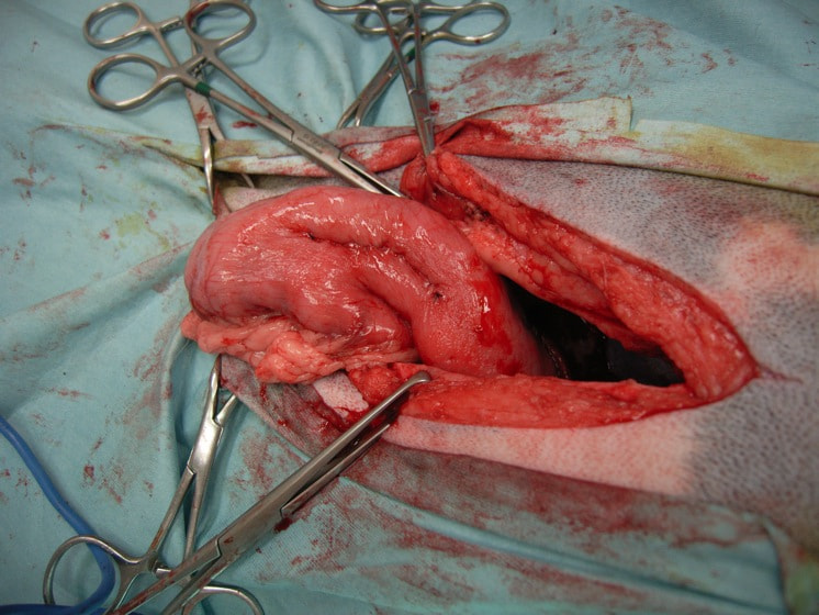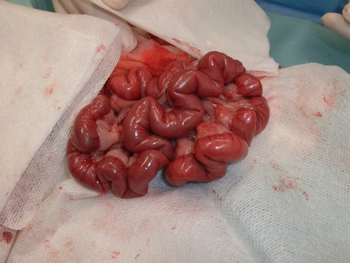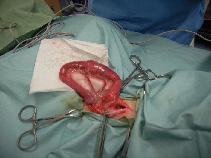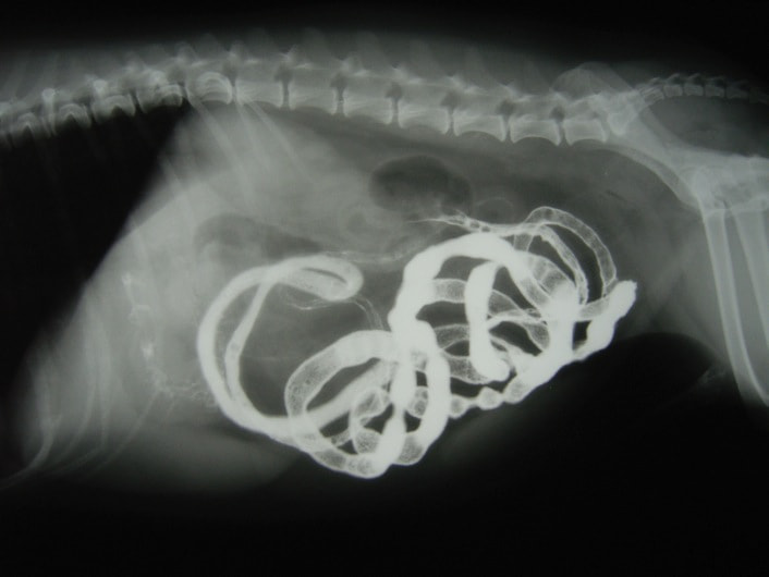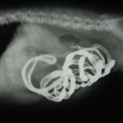 今回の様なヒモ状の異物は、腸の蠕動運動により腸管を傷つけ、発見が遅れると腸穿孔などの重篤な状態を引き起こします。本症例は、術後1週間程で回復し、現在の経過は良好です。
