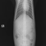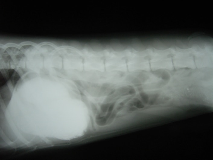 主訴:食欲、元気はあるが食後2時間で未消化物を嘔吐。異物癖あり。