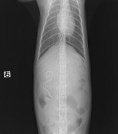 本症例は、 おもちゃのロープを誤飲したことにより腸で通過障害を引き起こし、嘔吐として症状が認められた。現在のところ、一般状態に問題なく経過観察を指示。