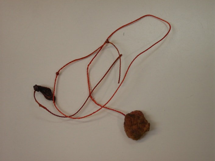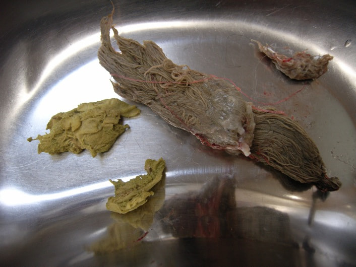 - 内視鏡検査:胃内にて4cm大のロープ様の異物を摘出。胃内、十二指腸内に炎症像が認められた。