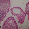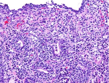 病理学的所見 : 多量の粘液を含む拡張した陰窩と肉芽組織の増生、リンパ球や好中球、マクロファージを主体とする炎症細胞の浸潤を認める。悪性所見を示す異型細胞浸潤や増殖は認められない。
