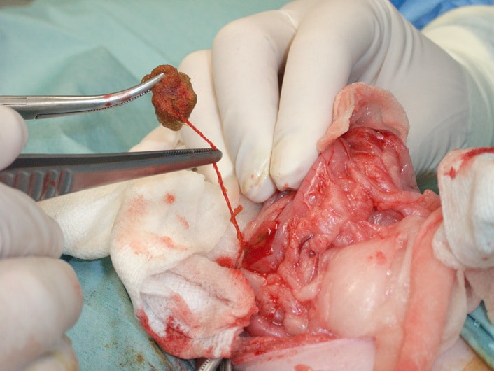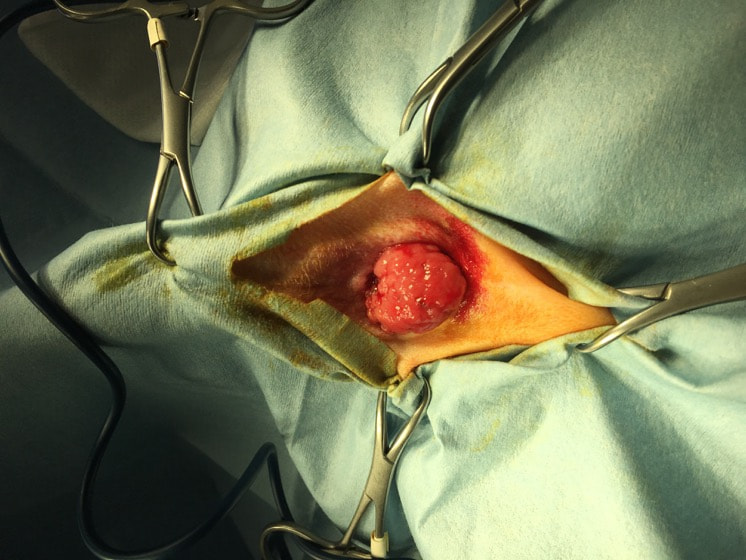 腫瘤が比較的大きい為、早期の外科的切除を提案しました。術前のCT検査にて腫瘤が孤立性であり肺やリンパ節への明らかな転移像がみられないことを確認した後、直腸腫瘤の切除手術を行いました。