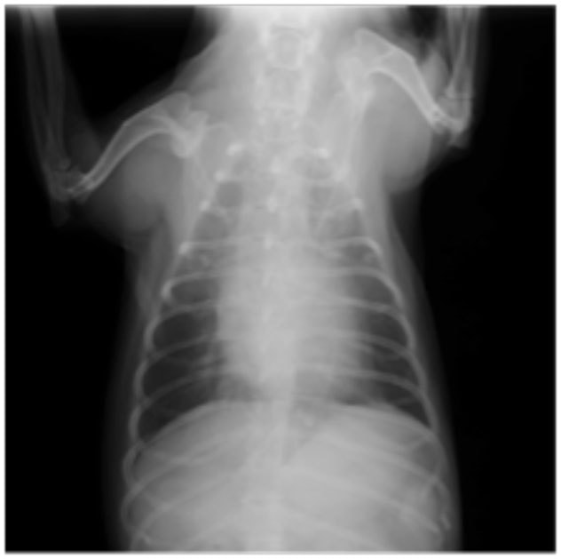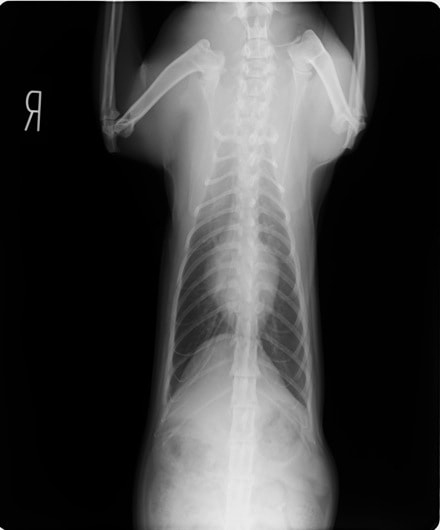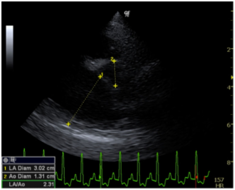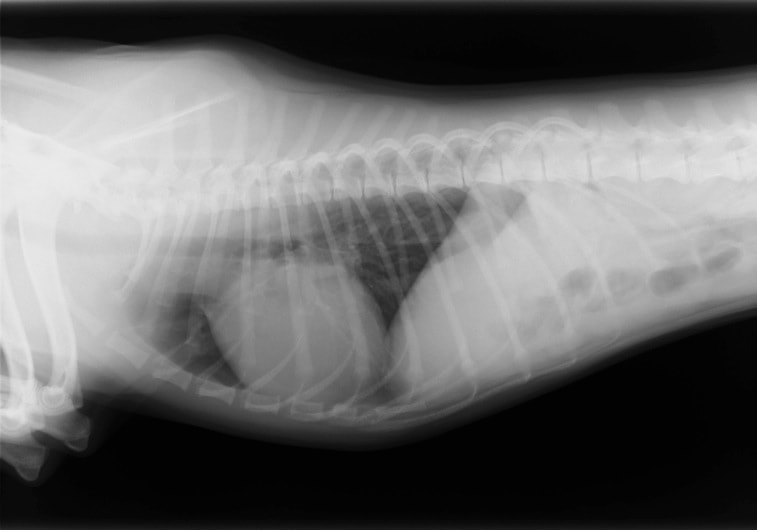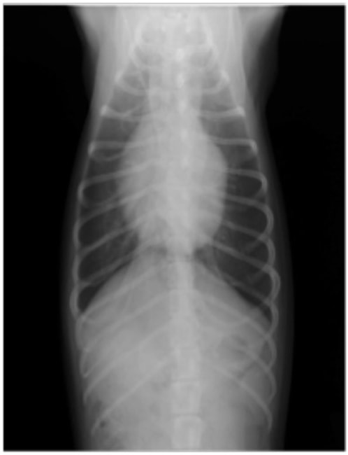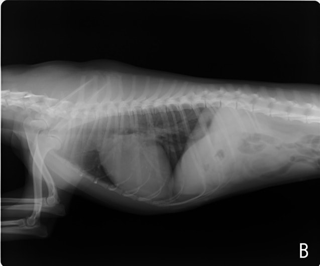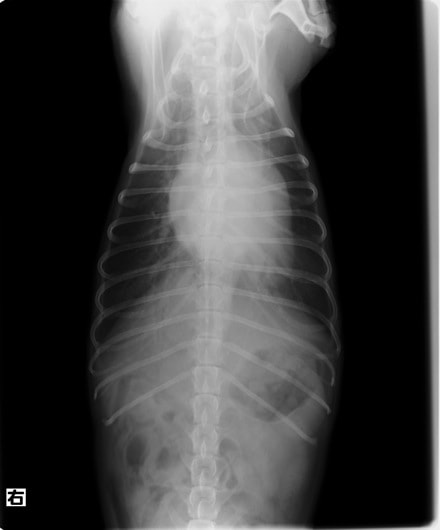 胸部レントゲン検査において重度の心拡大と肺水腫が認められた。超音波検査では、重度の僧帽弁閉鎖不全症、三尖弁閉鎖不全症、中程度の大動脈弁閉鎖不全症を合併していることが判明した。三尖弁逆流速度から肺高血圧症が示唆された。