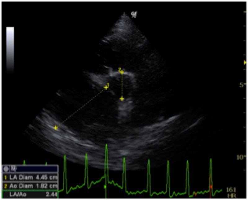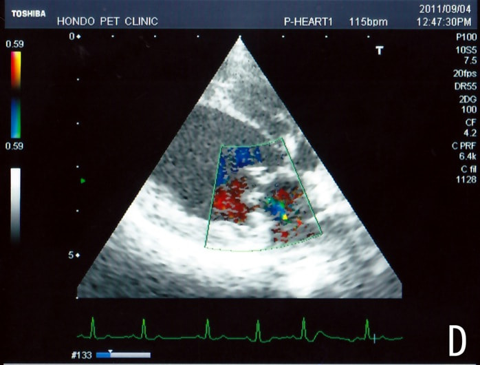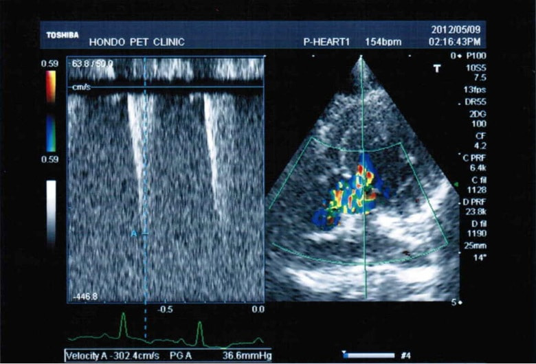 左側胸壁心尖部領域を最強点とするLevine 5/6の収縮期性心雑音が聴取された。安静時にも咳が認められる。胸部レントゲン検査において重度の心拡大が及び肺水腫が認められた。超音波検査では、重度の僧帽弁閉鎖不全、三尖弁閉鎖不全が認められた。三尖弁逆流速度から肺高血圧症が示唆された。ACE阻害薬、ピモベンダン、硝酸イソソルビド徐放剤、ベラプロストナトリウム、利尿剤としてフロセミド及びスピロノラクトンを用いて治療を行っている。