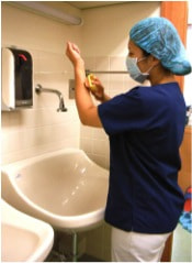手術者、手術助手、及び器械士は専用洗剤と ブラシを用いて指先から肘にかけて丁寧に殺 菌・消毒を行います。