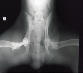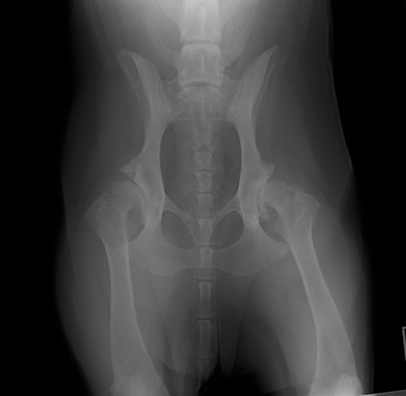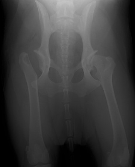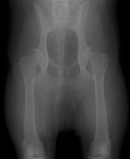 後肢の跛行を主訴に来院されました。レントゲン検査にて、左右股関節の形成不全および重度の関節炎所見を認めました。THRに関しては適応年齢(約9カ月齢以降)の範囲にありますが、左右とも長期に及ぶ骨関節炎の進行により、大腿骨頭・寛骨臼ともに重度の骨変形を伴っていました。このような症例において、THRのカップの定着が悪くTHRの手術の成功率が下がるため、機能回復の面では劣りますが、症状がより重いと判断された左後肢の大腿骨頭・骨頚切除術を実施しました。今後は、リハビリテーションを行い、患肢の機能回復に努めると共に、反対側の大腿骨頭・骨頚切除術を検討していく予定です。