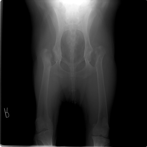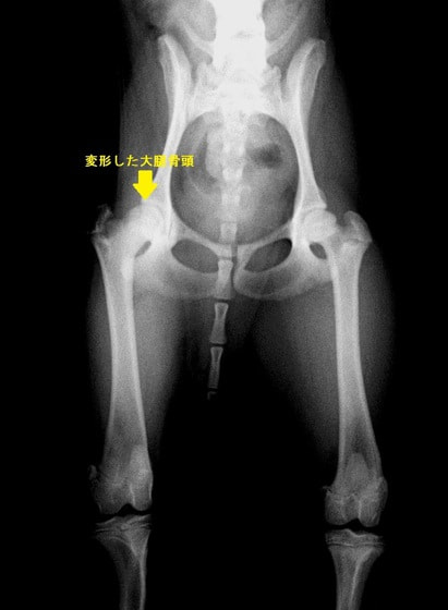 レッグペルテス病/無菌性大腿骨頭壊死症はトイ種やテリア種などの小型犬に好発し、5~8ヶ月齢の若齢期に多く発症します。大腿骨の先端(大腿骨頭)が、血液供給の障害により成長が阻害され、大腿骨頭の変形や壊死を起こす病気です。罹患動物は股関節の強い痛みのため、日常生活においては進行性の跛行(ケンケンをして歩く、足を地面に着かない等)の症状が認められます。肢を使わなくなるため筋肉量は減少し後肢は細くなります。