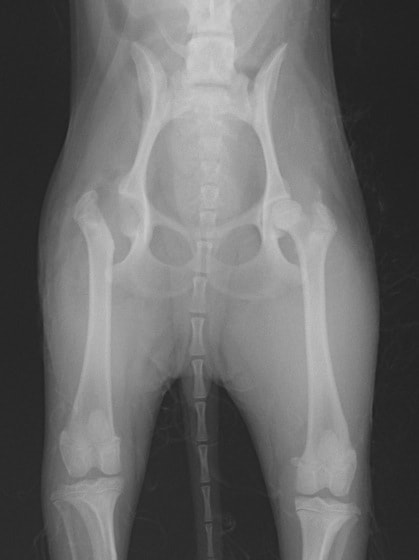 Orthopedic Foundation for Animals (OFA) が推奨するX線撮影法にて股関節の緩み、整合性、骨関節炎病変の程度を評価します。
