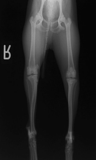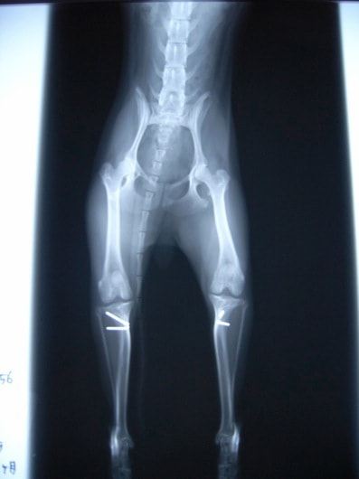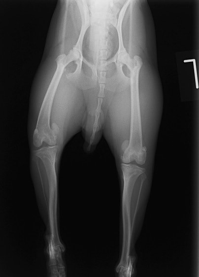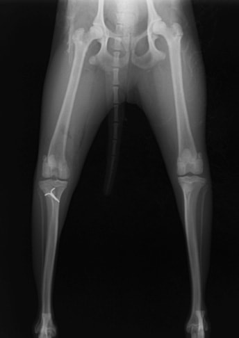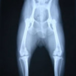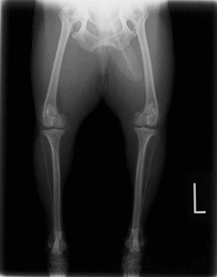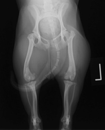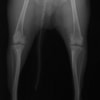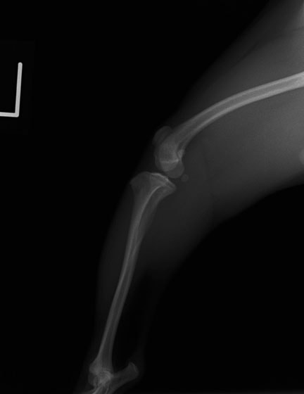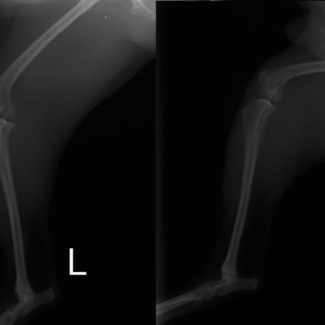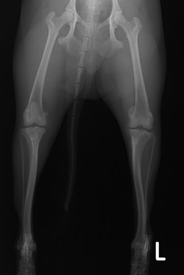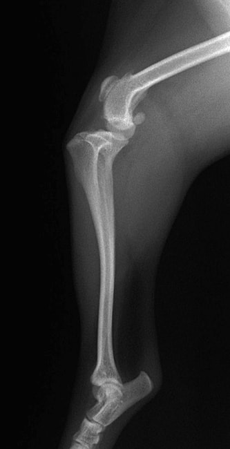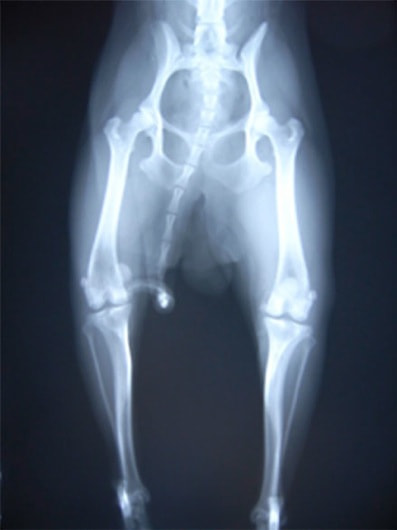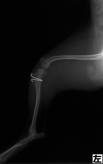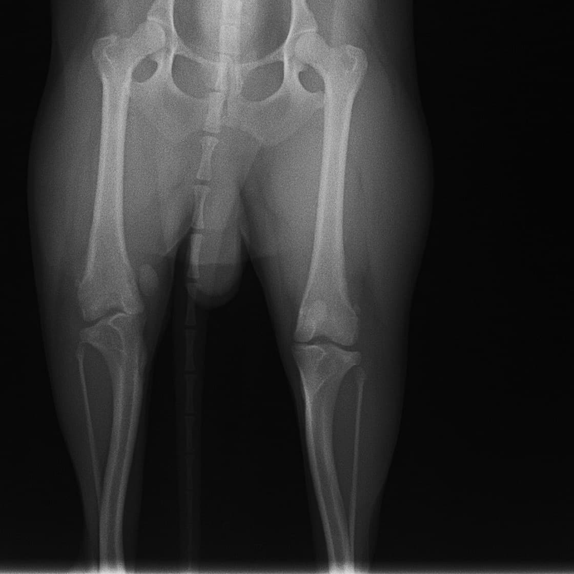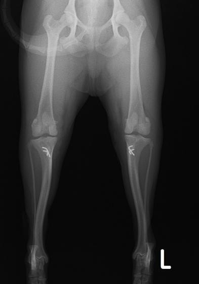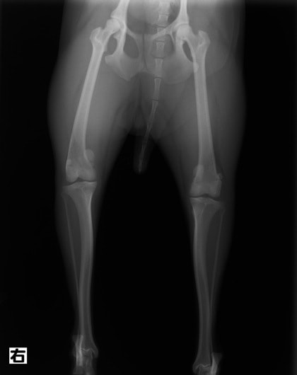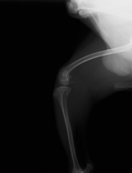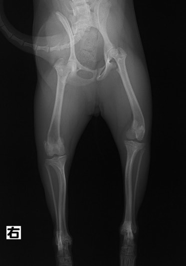 - 膝蓋骨は常に脱臼状態にあり、指で押せば整復できるがすぐに脱臼してしまいます。顕著な跛行がみられます。