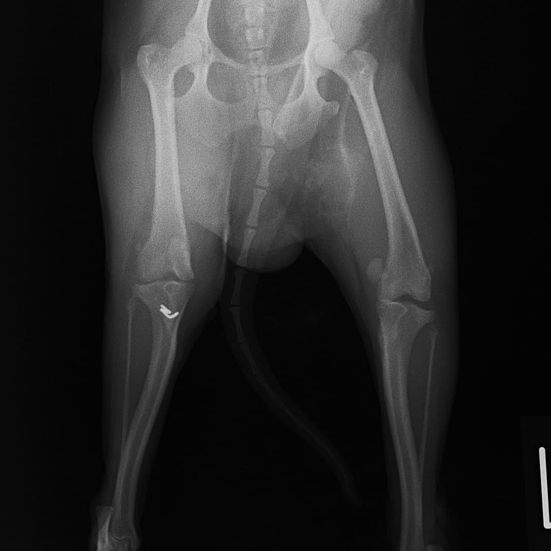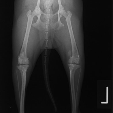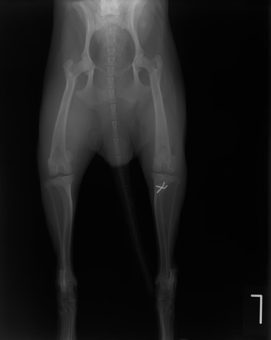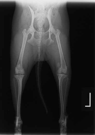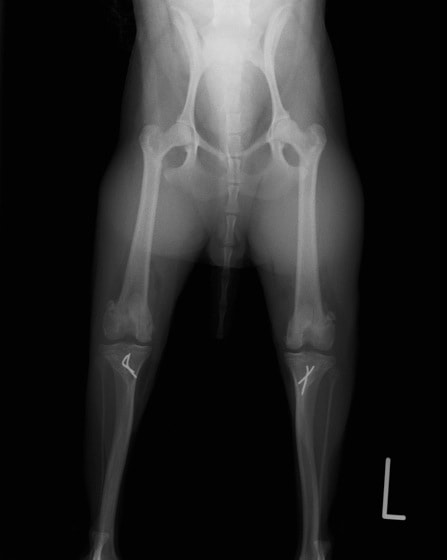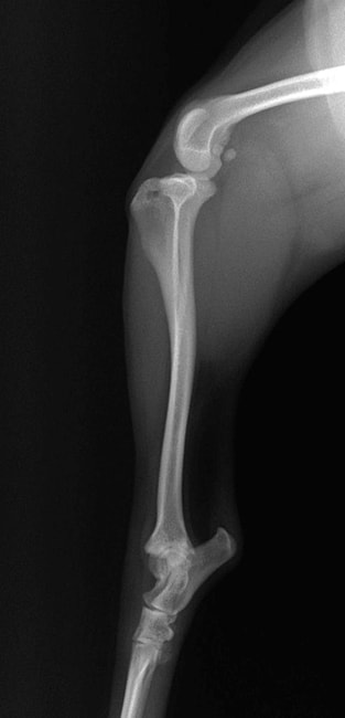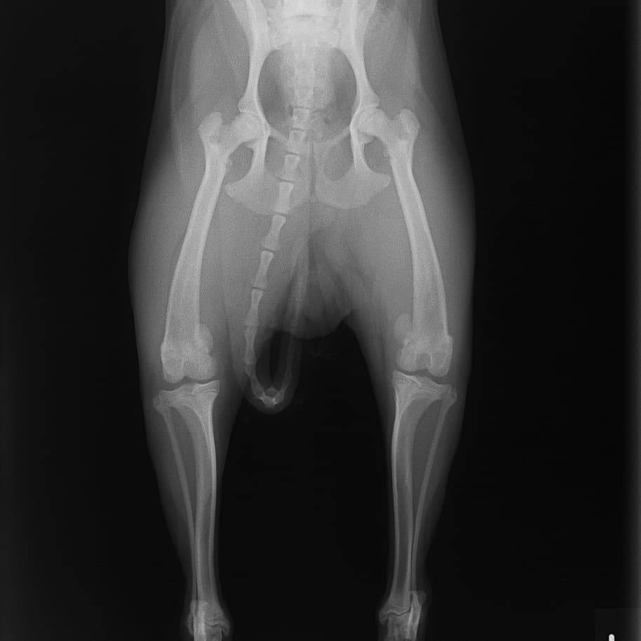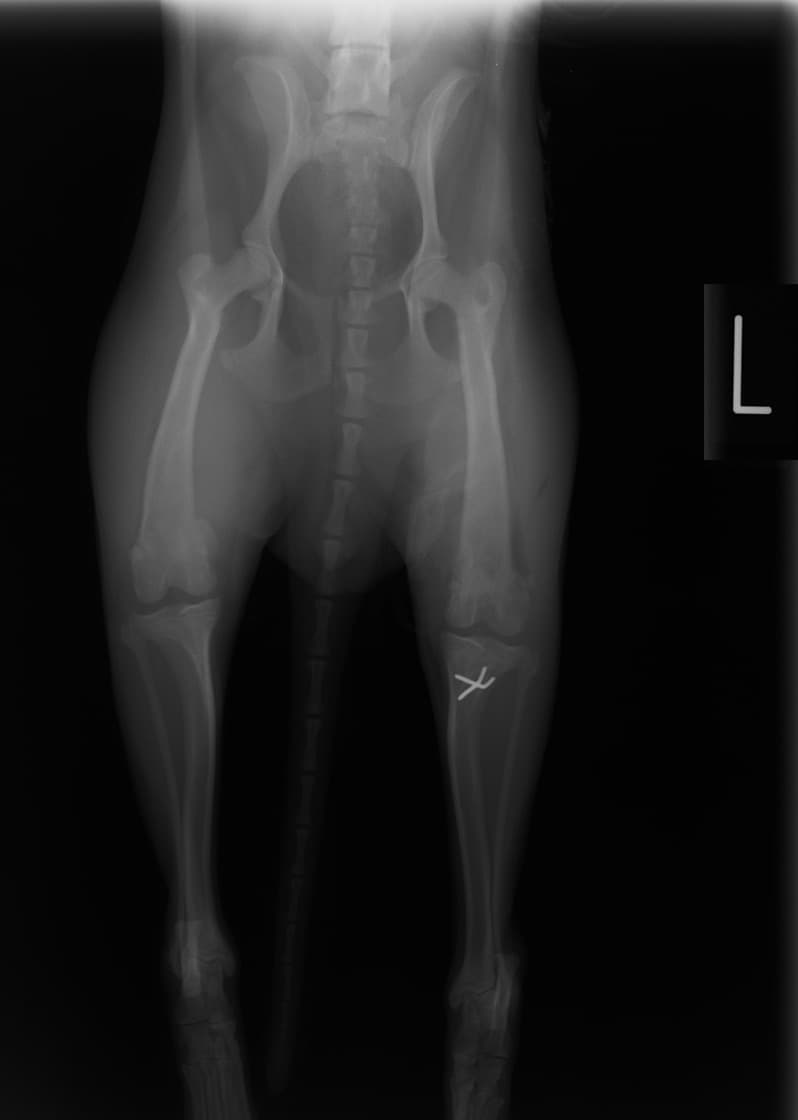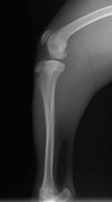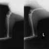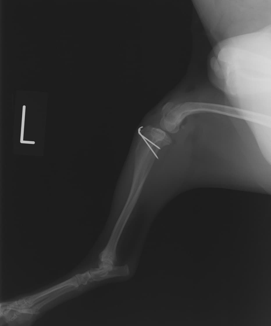 - 膝蓋骨は常に脱臼状態にあり、指で押せば整復できるがすぐに脱臼してしまいます。顕著な跛行がみられます。