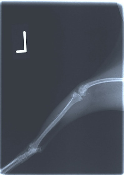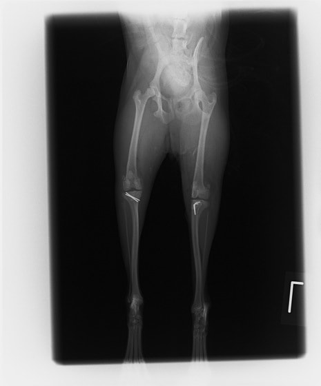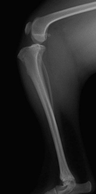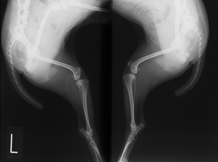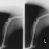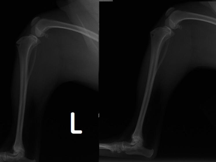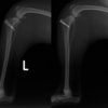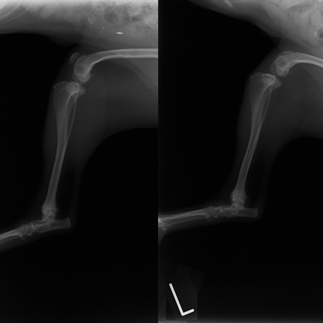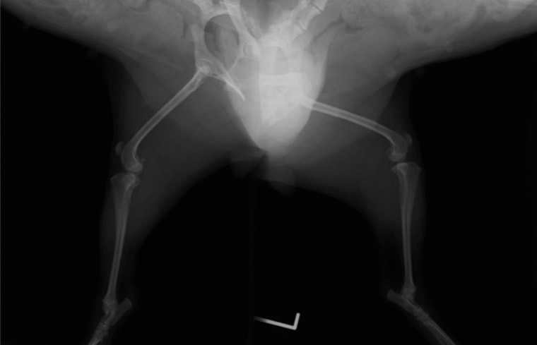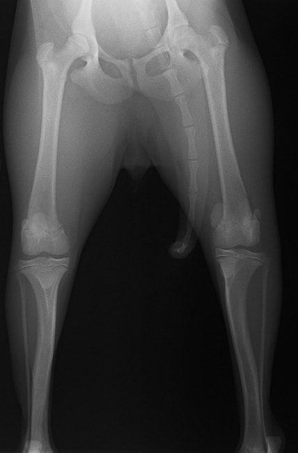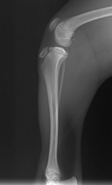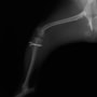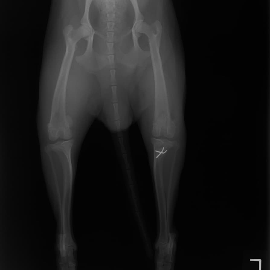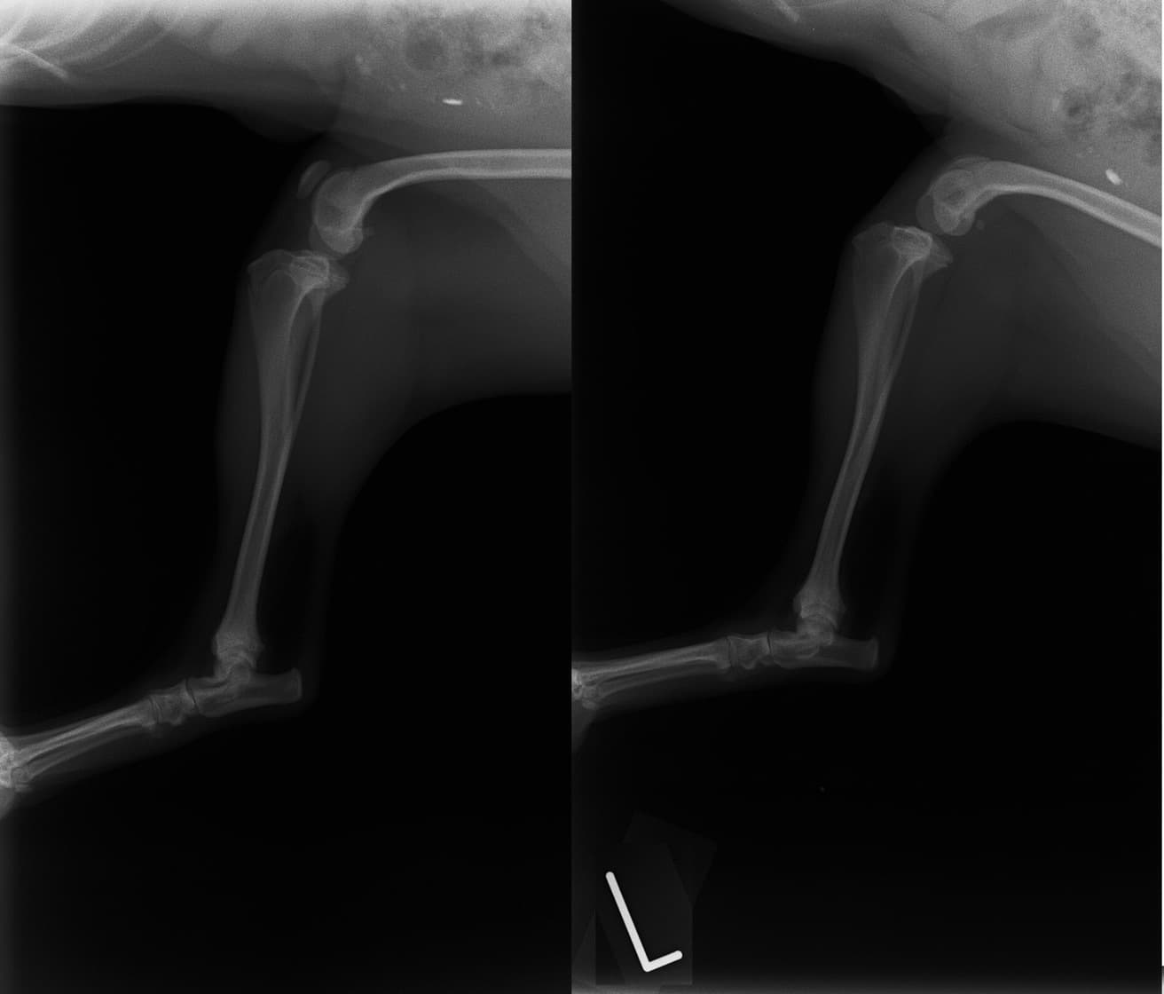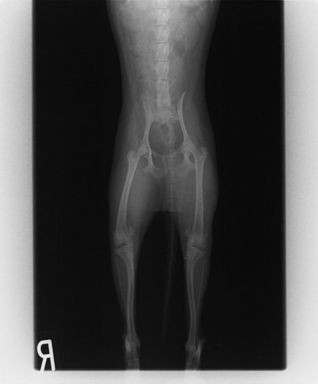 - 膝蓋骨は常に脱臼状態にあり、指で押せば整復できるがすぐに脱臼してしまいます。顕著な跛行がみられます。
