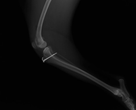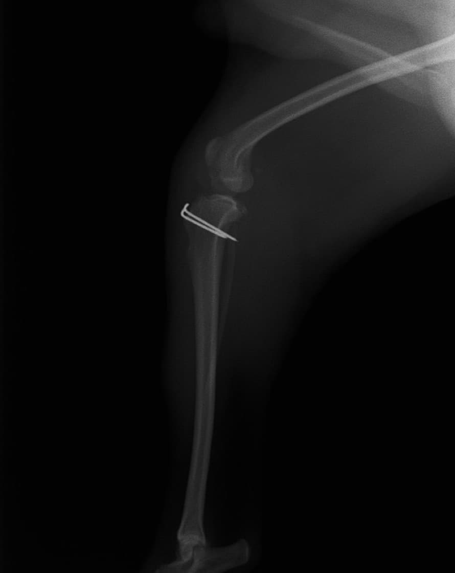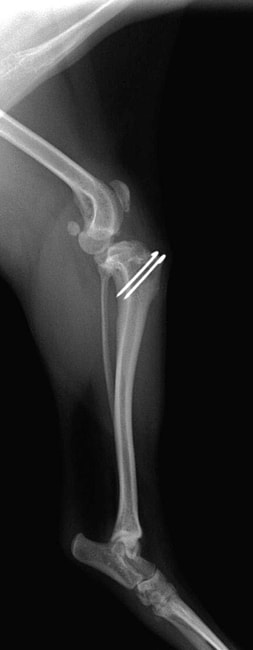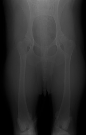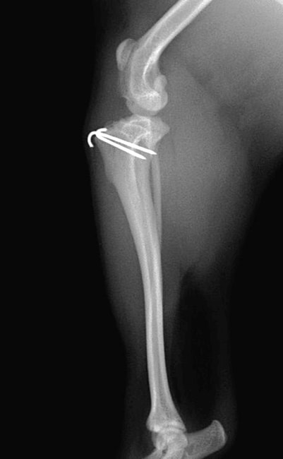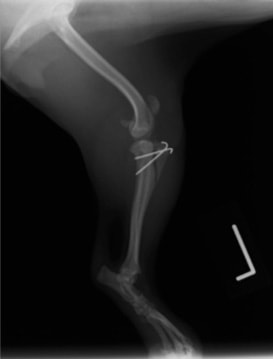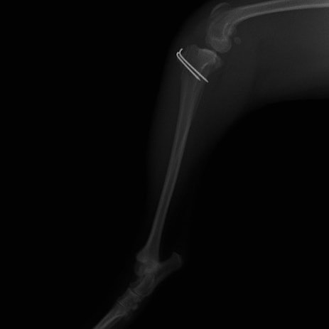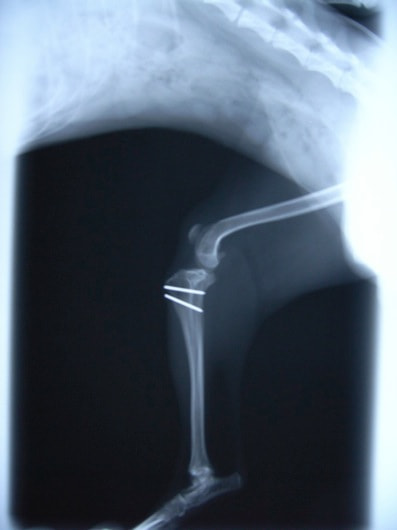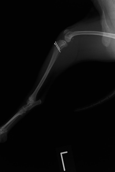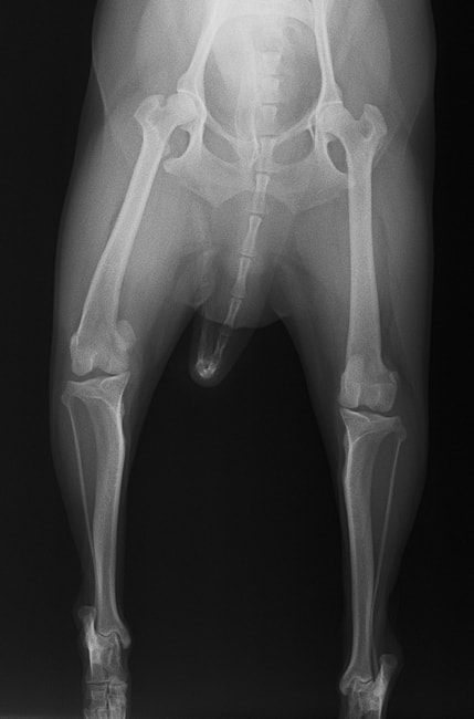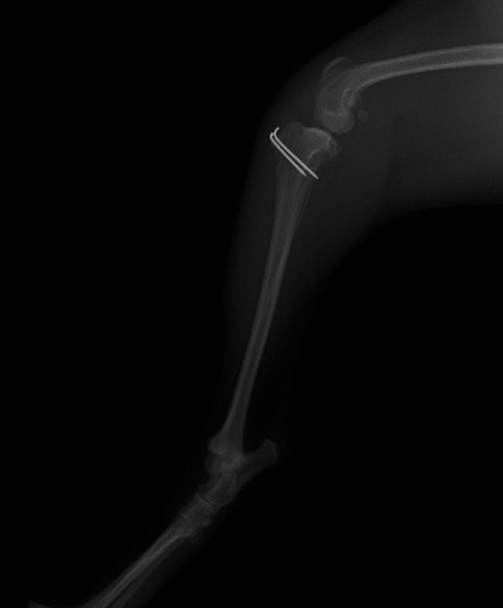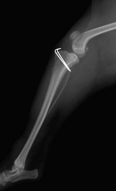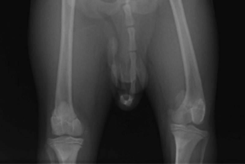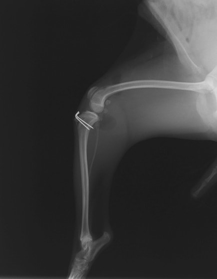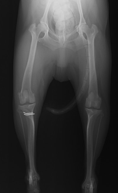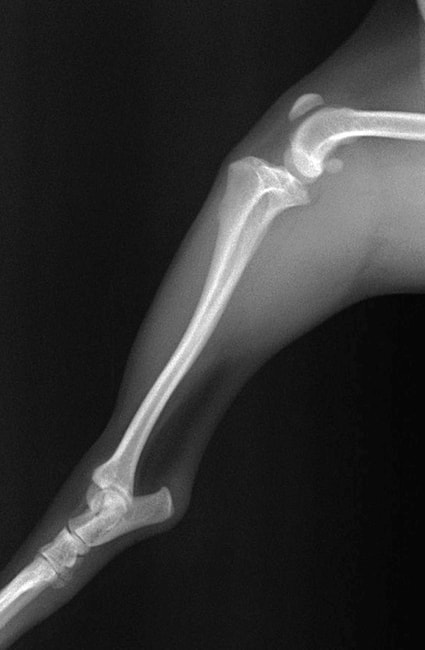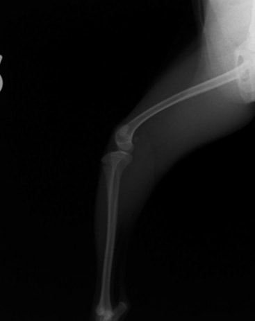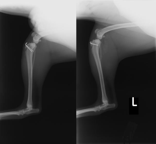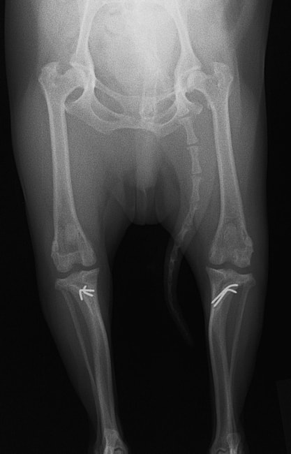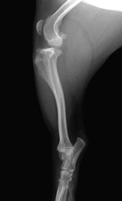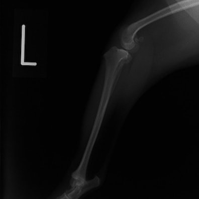 - 膝蓋骨は常に脱臼状態にあり、指で押せば整復できるがすぐに脱臼してしまいます。顕著な跛行がみられます。