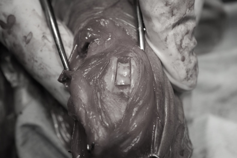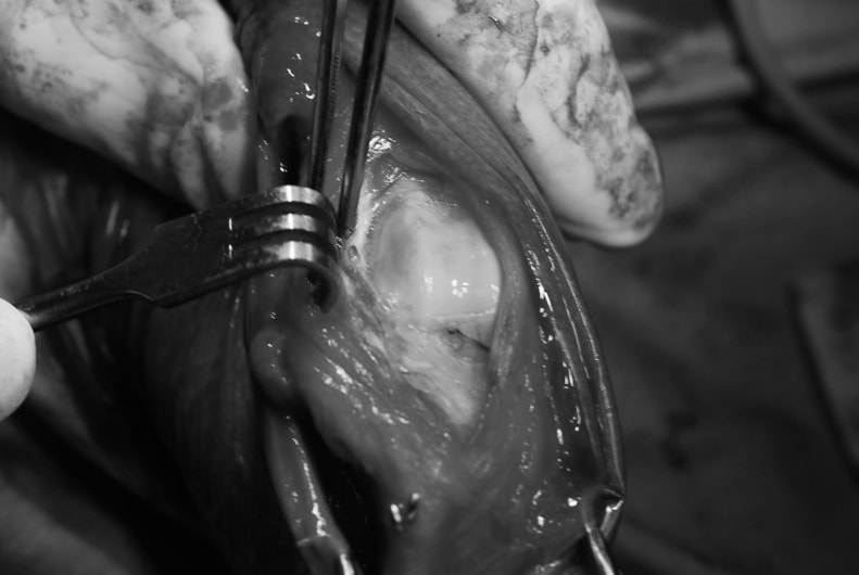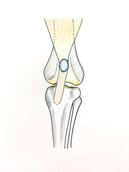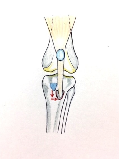 内側脱臼に加えて前方への浮き上がりを矯正する為に、従来より脛骨粗面転移により膝蓋靭帯を外方と下方に引っ張り、固定する方法を選択する。膝蓋骨の前方への浮き上がりが軽度の場合は、従来法ではなく関節包の縫縮で対応していた。しかし、一部の症例で膝蓋骨の動きが悪くなり伸展機構が円滑に機能せずロボット様歩行になるケースがあった。