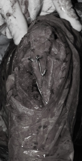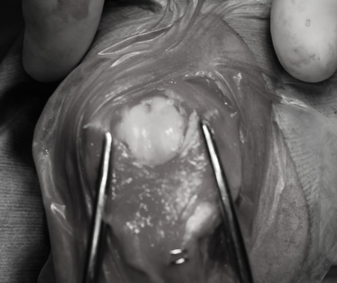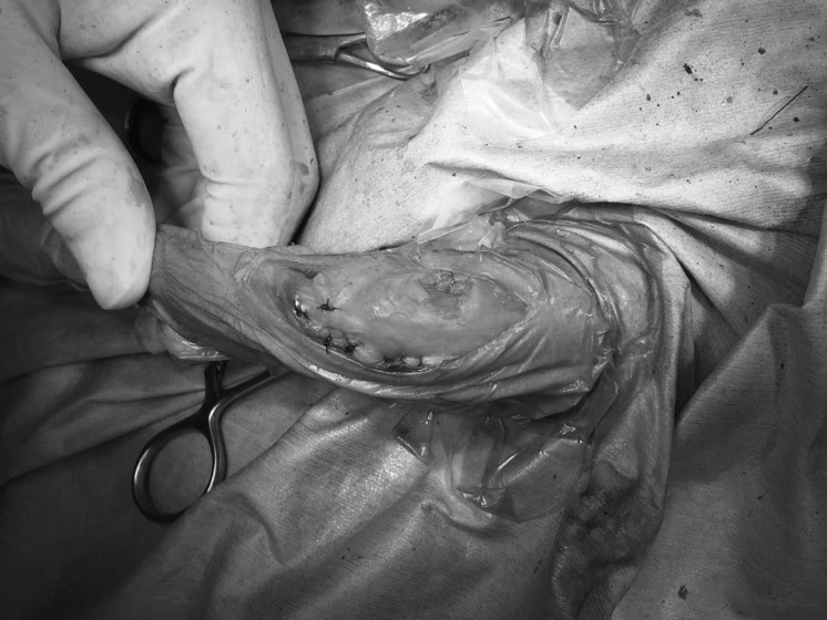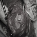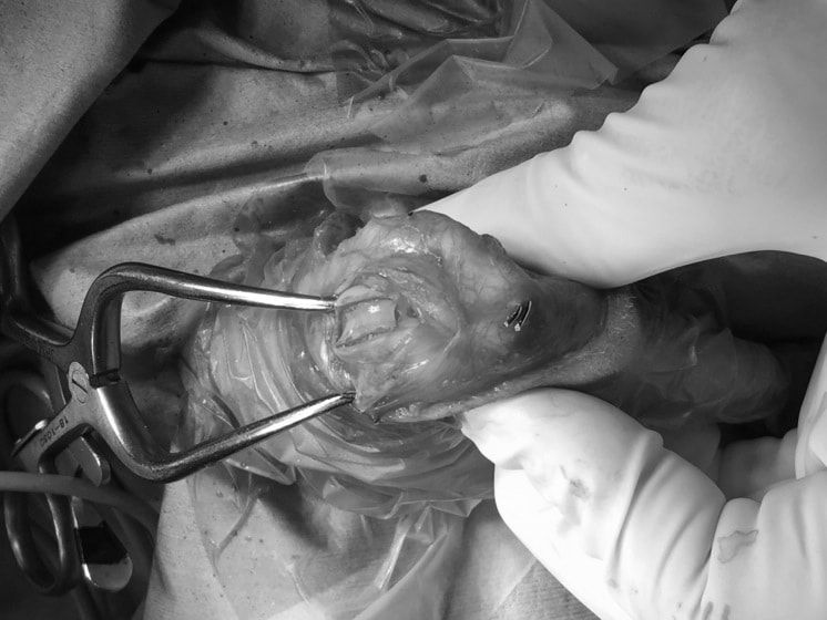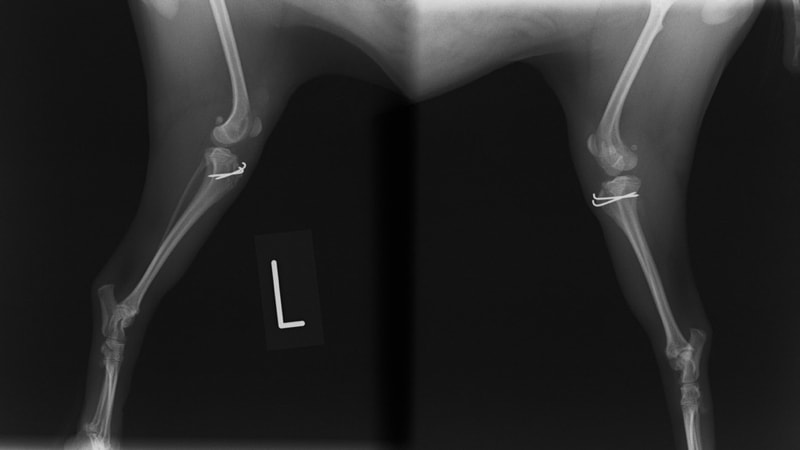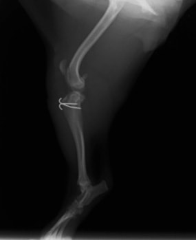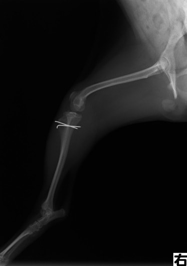 右側の膝蓋骨脱臼は上記手技で整復されたものの、左側はそれのみでは膝蓋骨が浮く様子が認められた。その為、PDS縫合糸にて膝蓋靱帯を1糸のみ縫合し、靱帯の縫縮を行った。