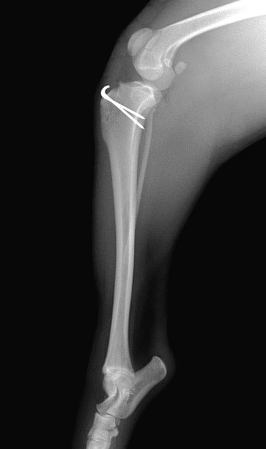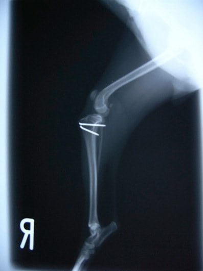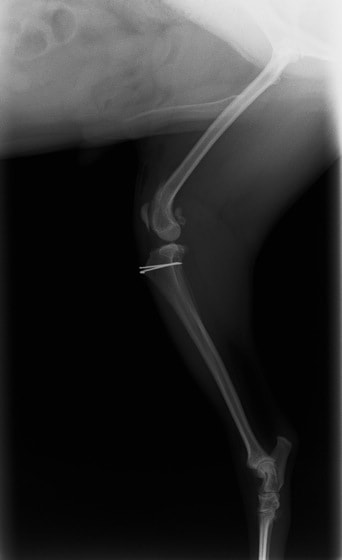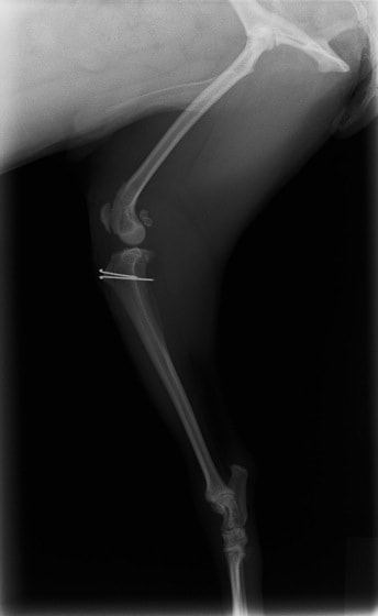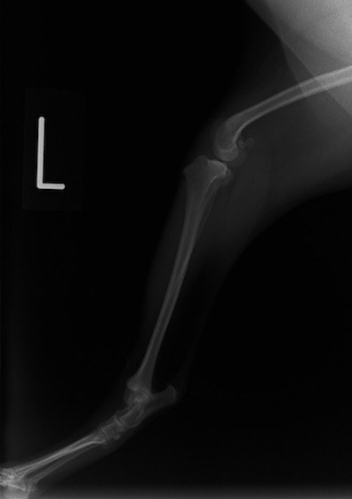 時々肢を挙上する間欠的な歩行異常が多く、常に肢を挙上するケースは少ないです。肢を後ろに伸ばす動作を繰り返し、それを主訴に来院されることもあります。日常生活において膝蓋骨の脱臼と整復を繰り返し、関節軟骨が磨耗すると症状は悪化し、歩行異常はより顕著化します。更に四頭筋機構が関節を安定化させられなくなることも手伝い、前十字靭帯断裂症が併発することもあります。