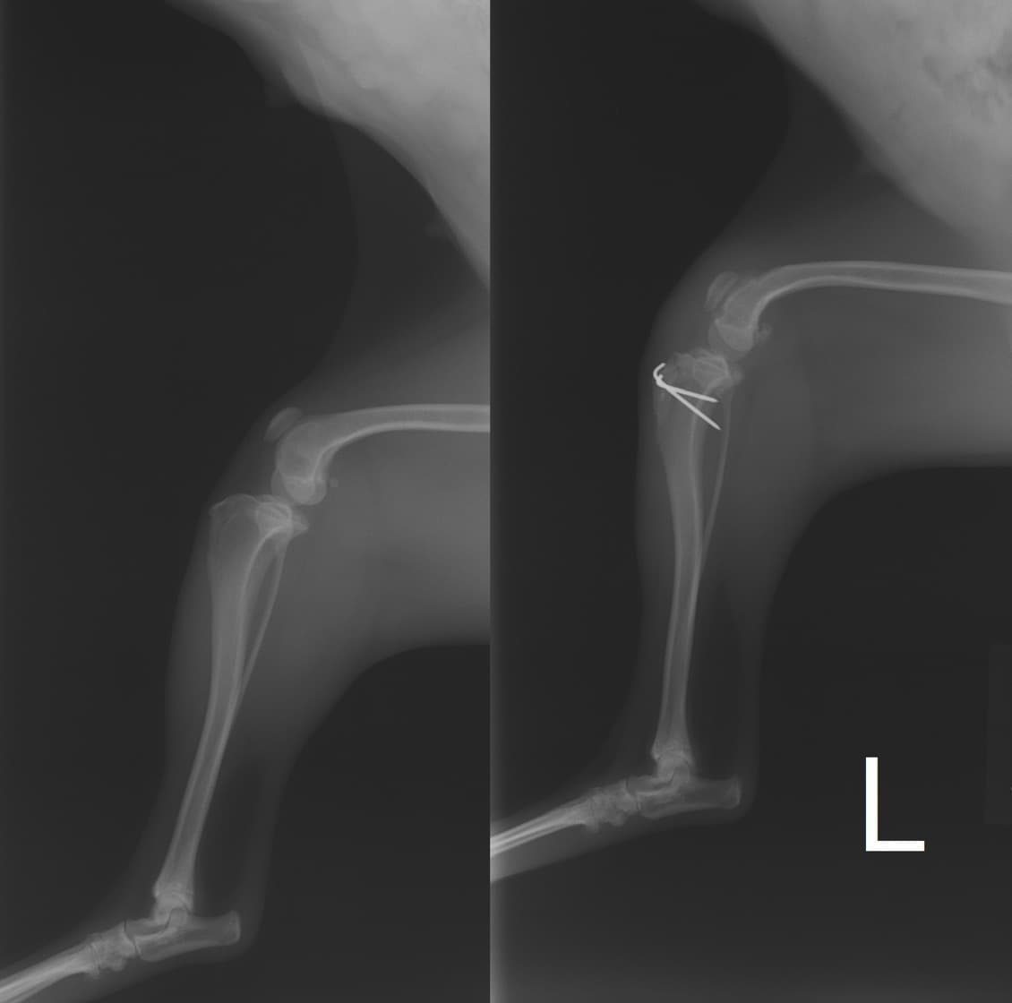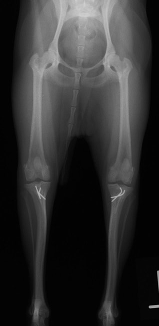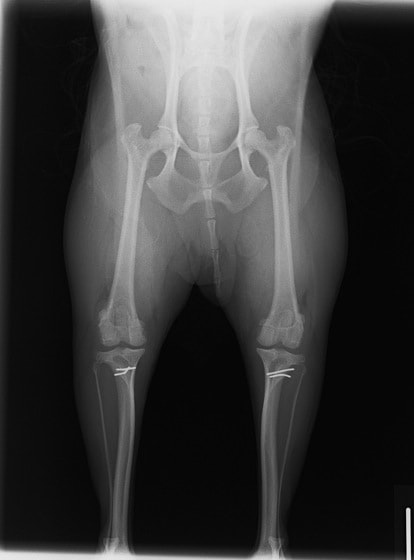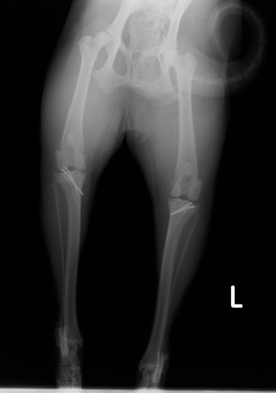 以前から左右後肢の跛行が認められ、整形外科学的検査・レントゲン検査により左右の膝蓋骨脱臼が認められた。症状が重度である左膝の膝蓋骨脱臼整復術を行った。外科手技は縫工筋及び内側広筋の解放、脛骨粗面の外側転位、滑車ブロック形造溝術、内外側関節方の縫縮を実施した。術後一か月時点で、左の膝蓋骨は安定しており経過は良好である。