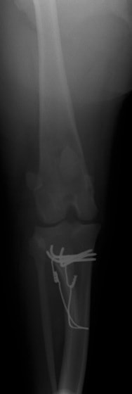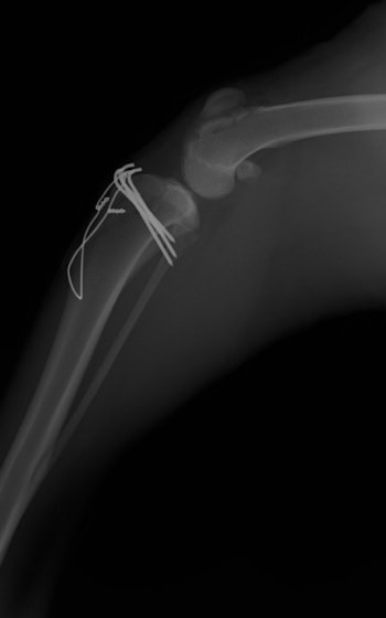 その為、膝蓋靭帯自体を縫縮する方法を採用した。この方法により、膝関節の伸展機構を妨げず膝蓋骨の軽度の浮きを矯正することが可能となった。