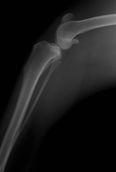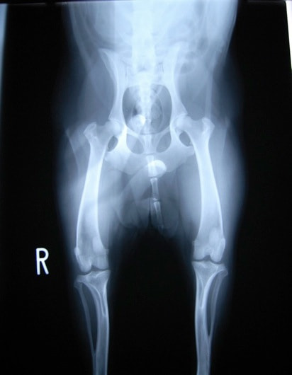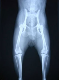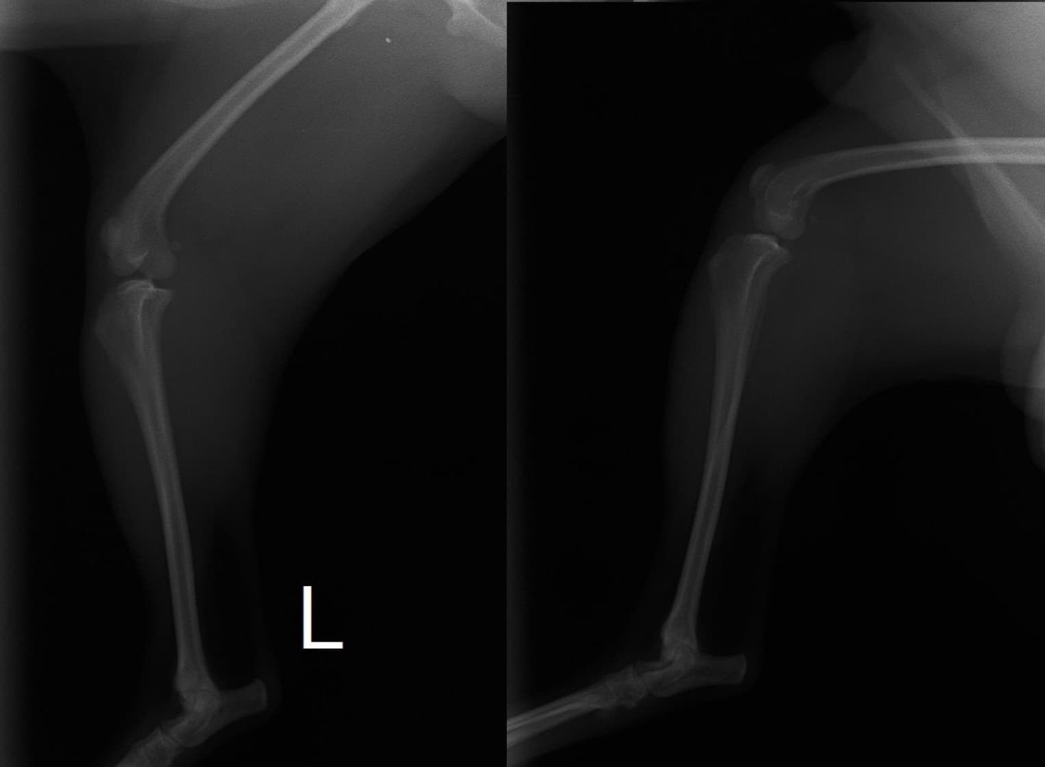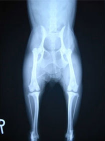 うずくまった姿勢で歩行するまたは、前肢に体重をのせ、患肢を浮かせたように歩行します。このように程度の差はありますが、痛み、腫れ、跛行、患肢の挙上など共通してみられるものもあります。特に小型犬においてよく見られる疾患で、長期間放置すると歩行異常や関節炎などに進行します。