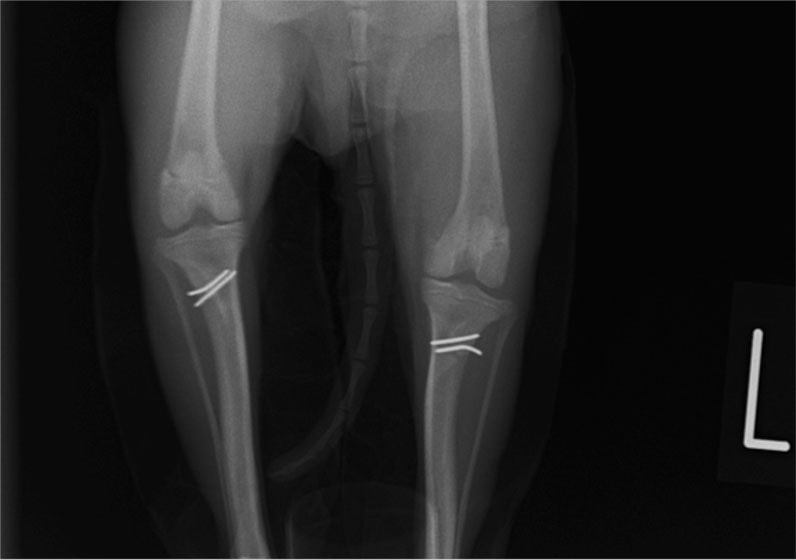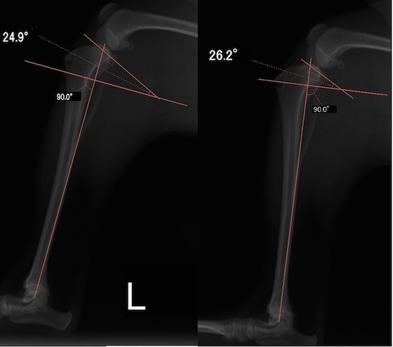 左後肢の挙上を主訴に来院した。整形学的検査、レントゲン検査より左右の膝蓋骨脱臼(左GradeⅡ〜Ⅲ、右Grade Ⅱ)を認めた。また、脛骨の前方引き出し試験の際に、引き出し兆候は認められないものの、疼痛が認められたため、前十字靭帯の損傷が疑われた。術中における、目視および関節内の操作によって、前十字靭帯の損傷や過伸展といった異常が認められなかったため、膝蓋骨脱臼の整復のみ実施した。手術手技は縫工筋及び内側広筋の解放、脛骨粗面の外側転位、滑車ブロック形造溝術、内外側関節包の縫縮を実施した。本症例は跛行もなく経過良好である。しかし、頸骨高平部の角度(TPA)が 右26.2°、左24.9°であり、解剖学的に前十字靭帯損傷のリスクが高いことから今後の経過に注意が必要である。