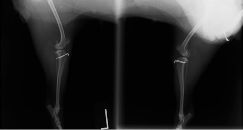 2ヶ月前から間欠的跛行が認められ、両膝の膝蓋骨脱臼整復術を行った。