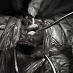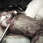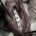 術中において、浅趾屈筋腱を剥離、内方へ牽引し、直接踵骨から第4足根骨までピンを挿入し(あらかじめ細いピンで下穴をあけておくとよい)、テンションバンドワイヤー法を併用し、関節軟骨の掻爬と海綿骨移植を実施しました。